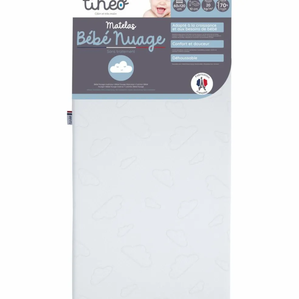 Le matelas 60x120cm nuage de Tinéo, se compose d’une âme en mousse de polyuréthane. Il s’agit de la matière de garnissage la plus répandue pour les matelas bébé. Elle propose l’avantage de s’adapter parfaitement au corps de votre enfant, en lui garantissant confort et suffisamment de fermeté pour un sommeil réparateur. Légère et donc facile à manipuler, la mousse polyuréthane offre aux matelas une facilité supplémentaire lors du changement du linge de lit.