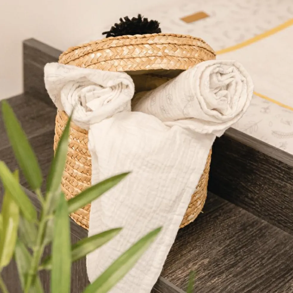 – En mousseline de coton bio certifié GOTS.