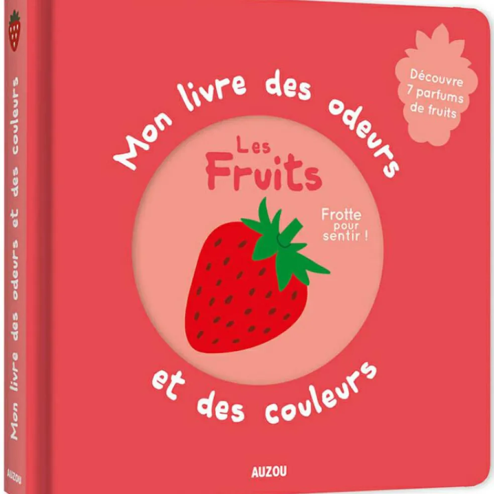 Que se cache-t-il derrière le rabat ? En frottant son doigt, l’enfant y découvrira une odeur que l’on trouve sur l’étal de fruits de la couleur de la page.