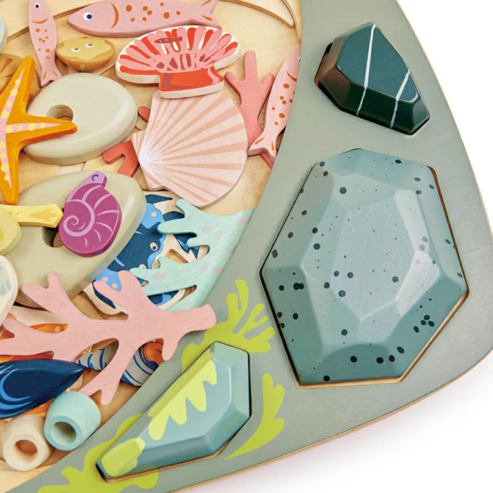 Sous les rochers se cachent des créatures marines à découvrir, invitant votre enfant à jouer à cache-cache avec des poissons et des crevettes tout en développant sa motricité fine. Grâce à ses formes à trier, ce jeu devient un véritable puzzle interactif qui stimule à la fois la créativité et la concentration.