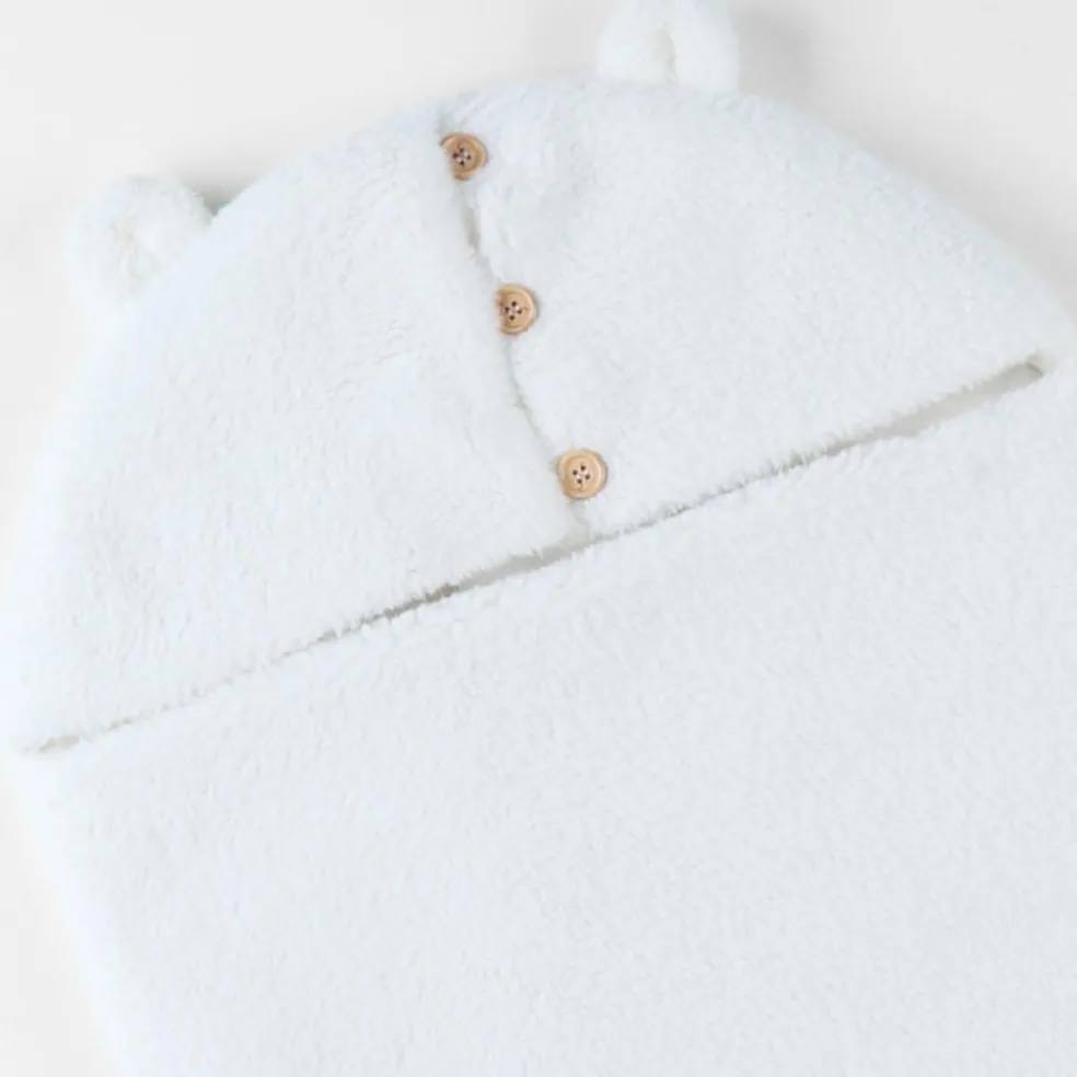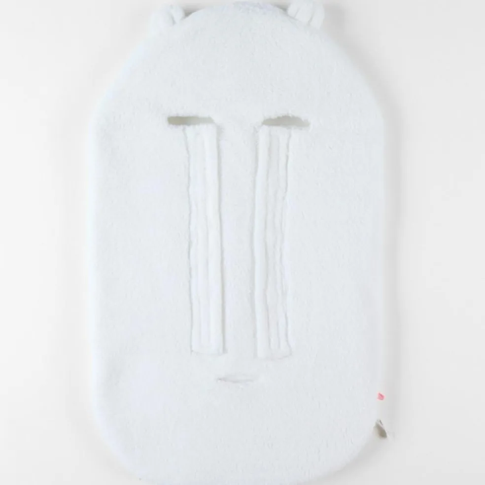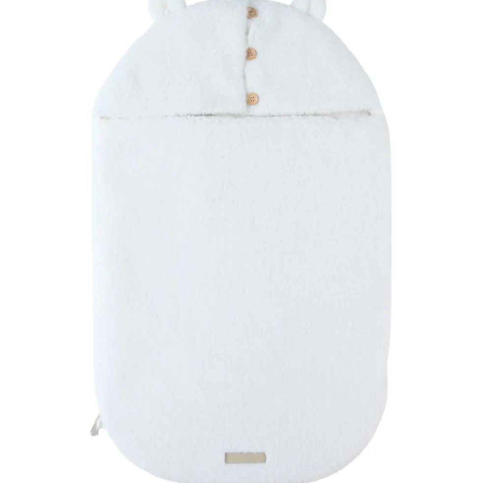 – Ce nid d’ange, en sherpa écru, est parfait pour la sortie de la maternité.