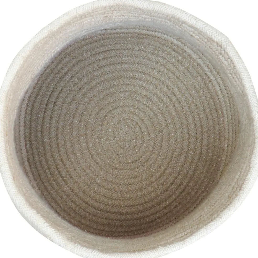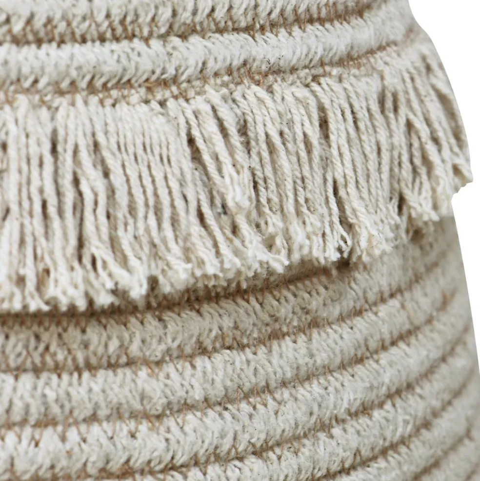 – Le panier, légèrement incurvé, est fait de cordes tressées, utilisant des fils de bouteilles PET recyclées combinés à du coton, avec des franges décoratives.