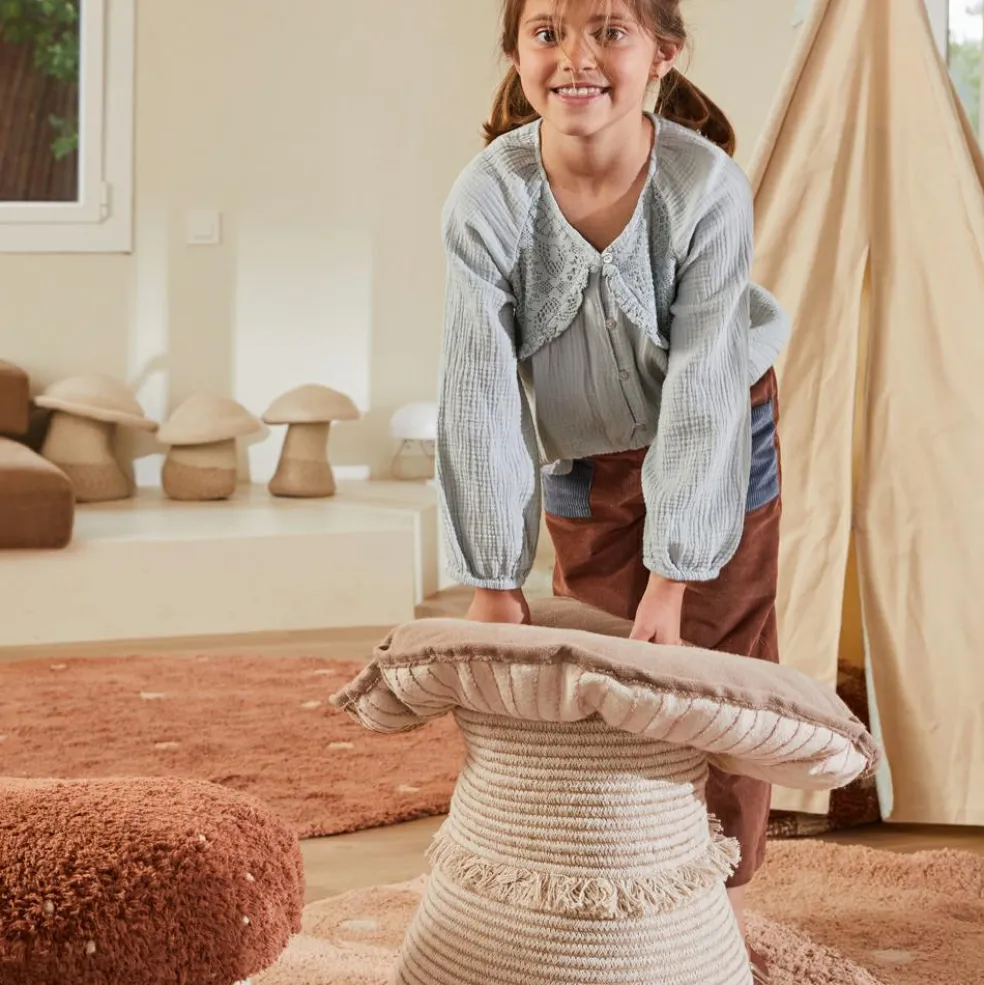 – La partie supérieure du champignon est un coussin en toile de coton doux, de couleur naturelle et marron clair, avec des points de broderie décoratifs, imitant le chapeau d’un champignon.