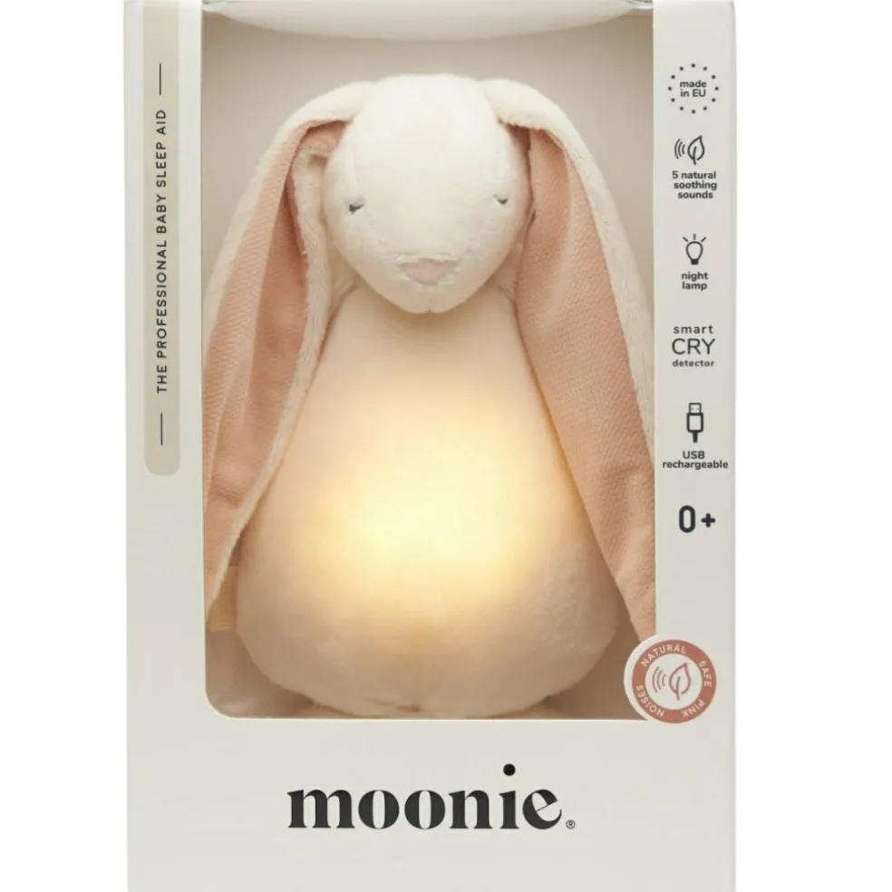 Offrez des nuits paisibles à bébé avec la Peluche veilleuse lapin nature bio avec sons & lumières 2.0 de Moonie ! Les bruits roses naturels et sûrs de Moonie on tdéjà réussi à endormir des centaines de milliers de bébés.