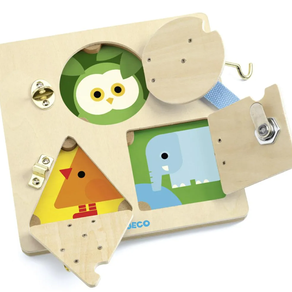La planche à verrou LockBasic de la marque Djeco stimule l’éveil des tout-petits et développe leur préhension fine.