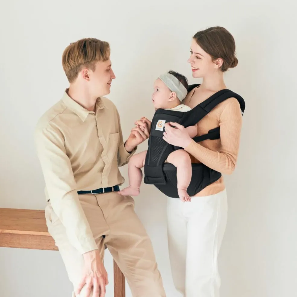 Pour le porteur, la ceinture rembourrée avec soutien dorsal répartit le poids de manière équilibrée, soulageant les épaules et le bas du dos. Le tissu en maille Mesh respirante permet une excellente aération, maintenant parent et enfant au frais. Et grâce à ses poches de rangement pratiques (grande poche zippée + poche en filet), vous gardez vos essentiels à portée de main.