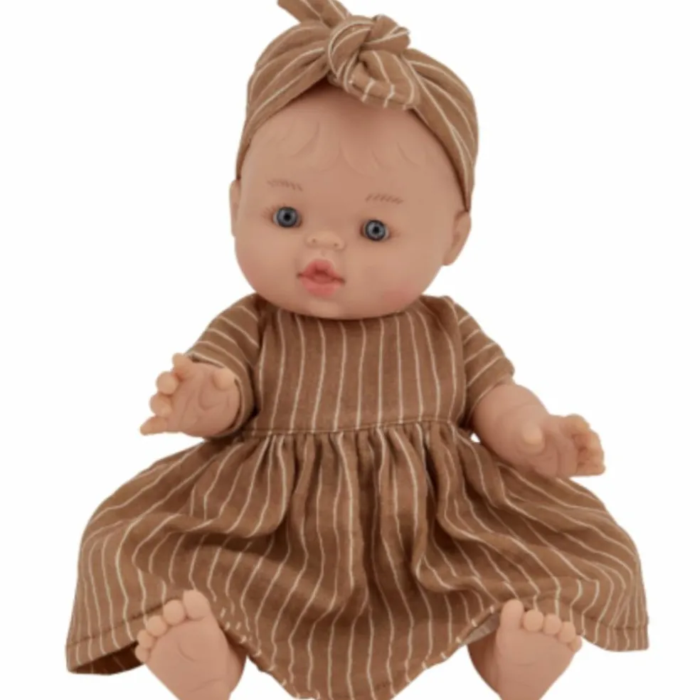Avec son doux parfum de vanille et ses traits délicats, Jade séduira les petits par son réalisme et son charme. Habillée d’une robe en gaze de coton aux fines rayures, confectionnée au Portugal, elle allie élégance et confort. Sa taille de 34 cm est parfaitement adaptée aux petites mains, encourageant autonomie, motricité fine et imagination.