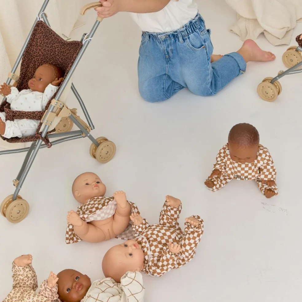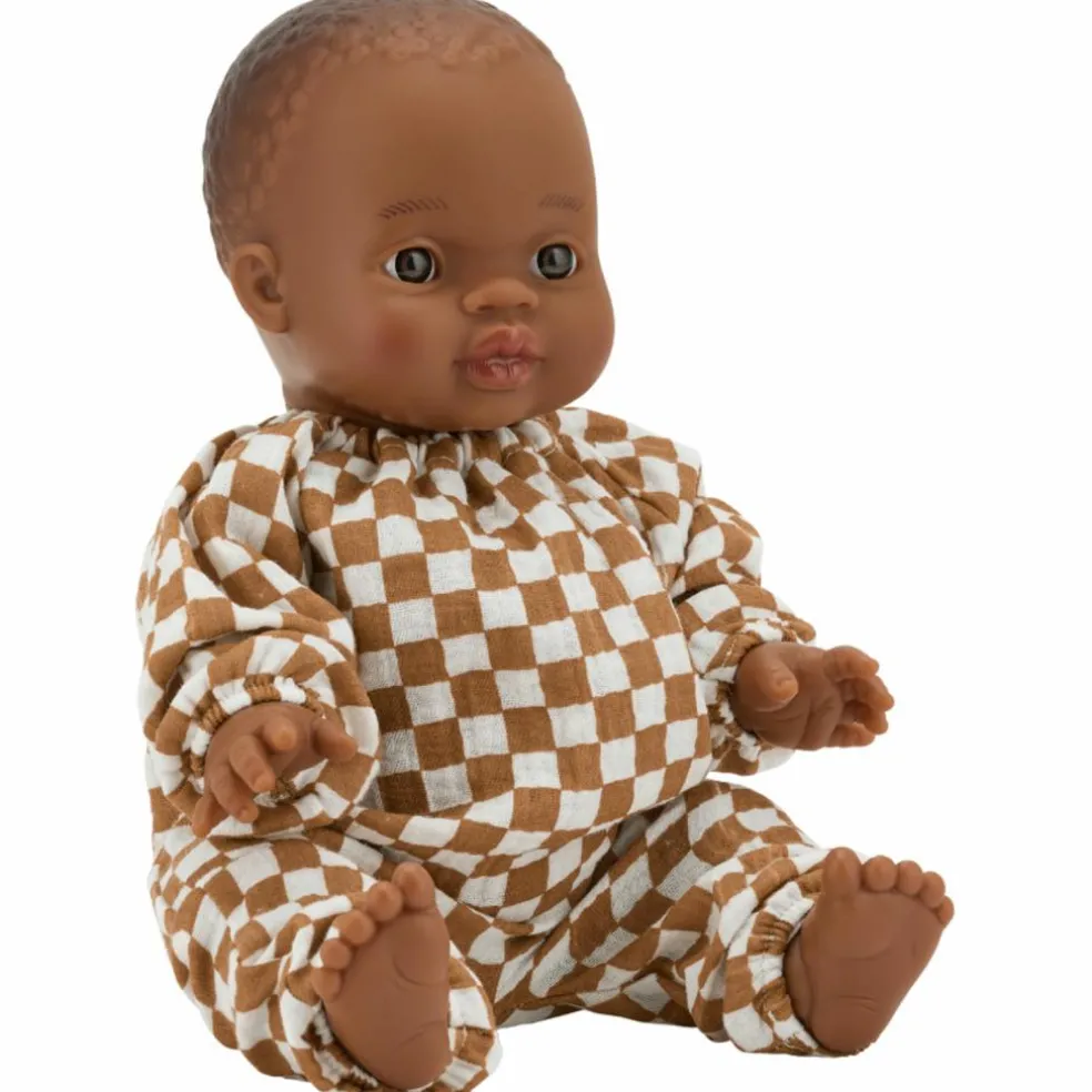 Avec son doux parfum de vanille et son regard attendrissant, Sacha deviendra vite la compagne préférée des enfants. Mesurant 34 cm, cette poupée est parfaitement adaptée aux petites mains et encourage les jeux d’imitation riches en imagination. Sa tenue sans col en gaze de coton, fabriquée au Portugal, se distingue par son joli imprimé damier marron et blanc, à la fois moderne et intemporel.
