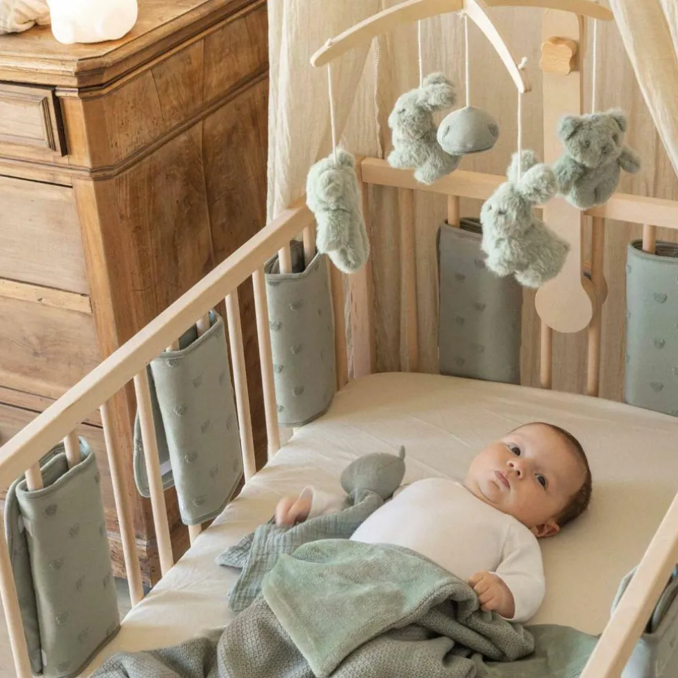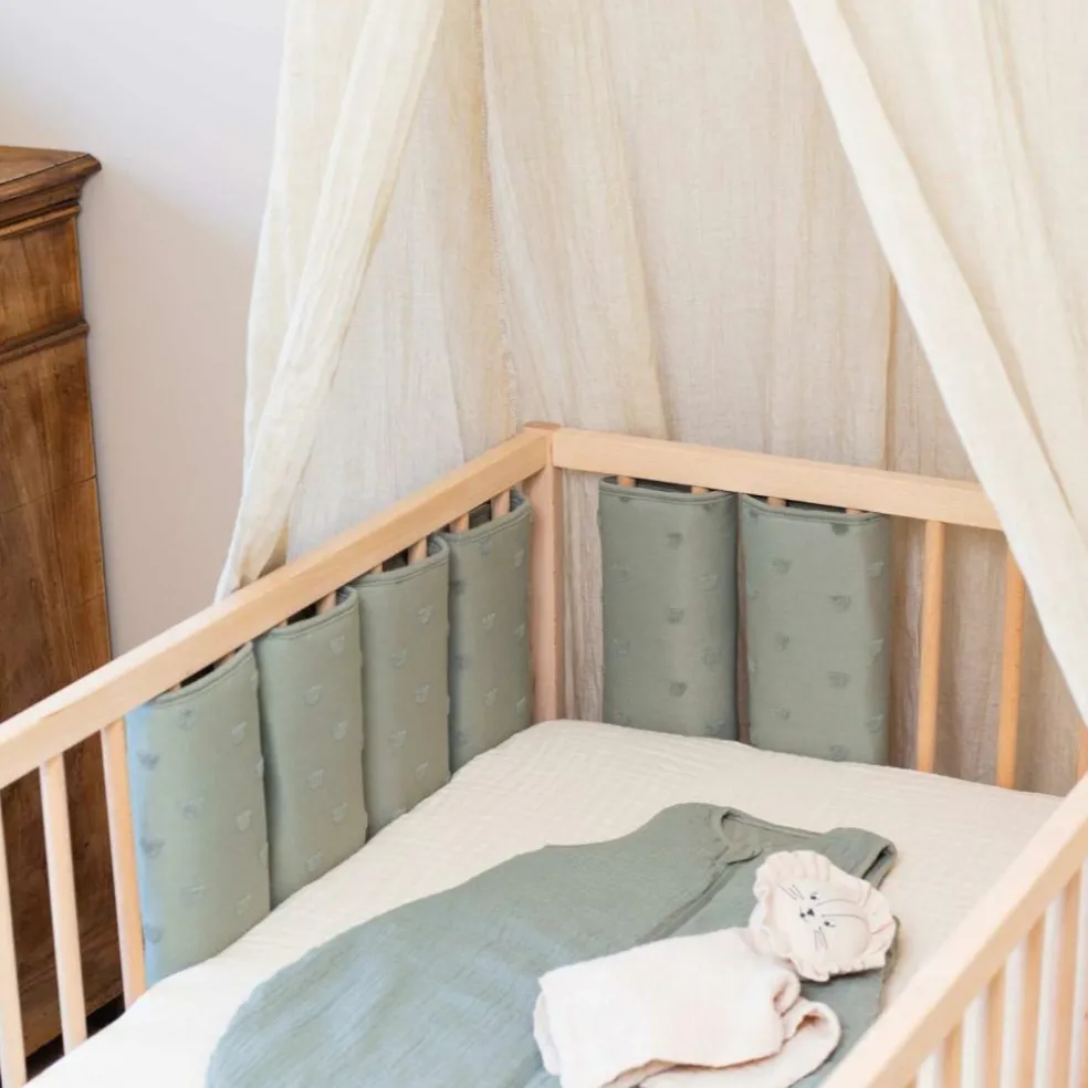 Son design mixte et apaisant, avec de délicats motifs ours ton sur ton sur un tissu vert sauge, apporte une touche de tendresse naturelle à la chambre de bébé. En plus d’assurer une protection efficace contre les petits chocs, il crée un cocon rassurant propice au sommeil.