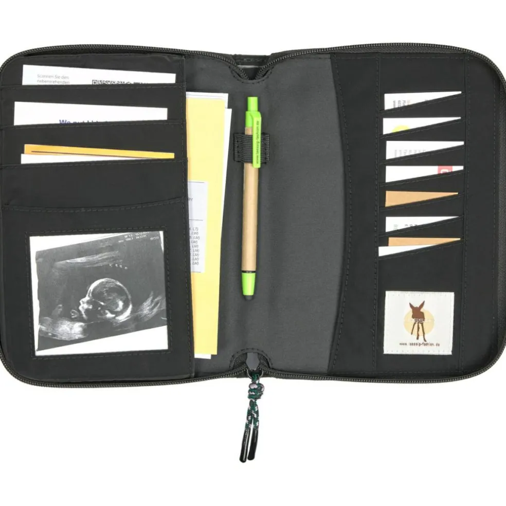 – Les documents tels que le carnet de santé, les échographies, la carte d’assurance-maladie ou encore le carnet de vaccinations trouveront parfaitement leurs places dans cette pochette aux nombreux compartiments.