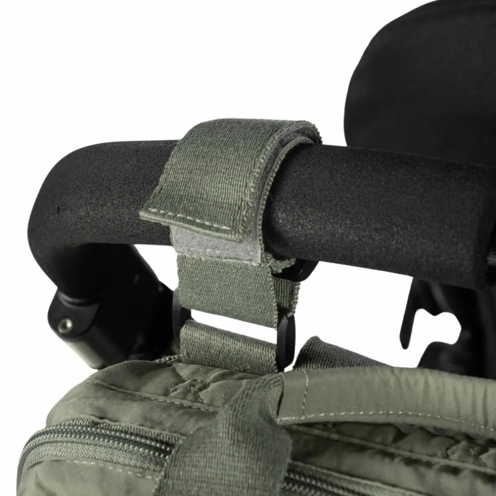 – Le sac à dos est doté de deux grandes bretelles réglables pour le porter sur le dos, de poignées à main et de deux petites sangles pour l’attacher à la poussette.