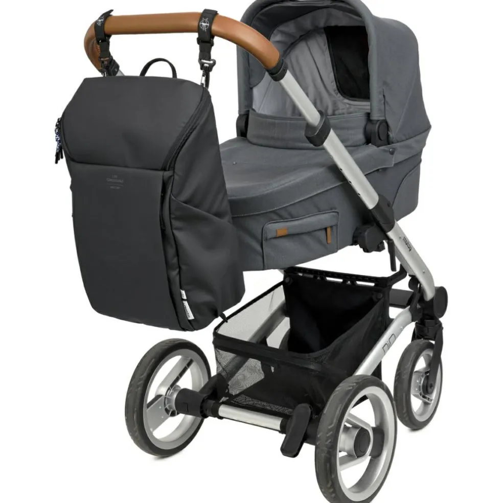 – Le sac à dos à langer se fixe facilement à une poussette, et pour les voyages en famille il peut se fixer à une valise à roulettes grâce à sa boucle au dos.