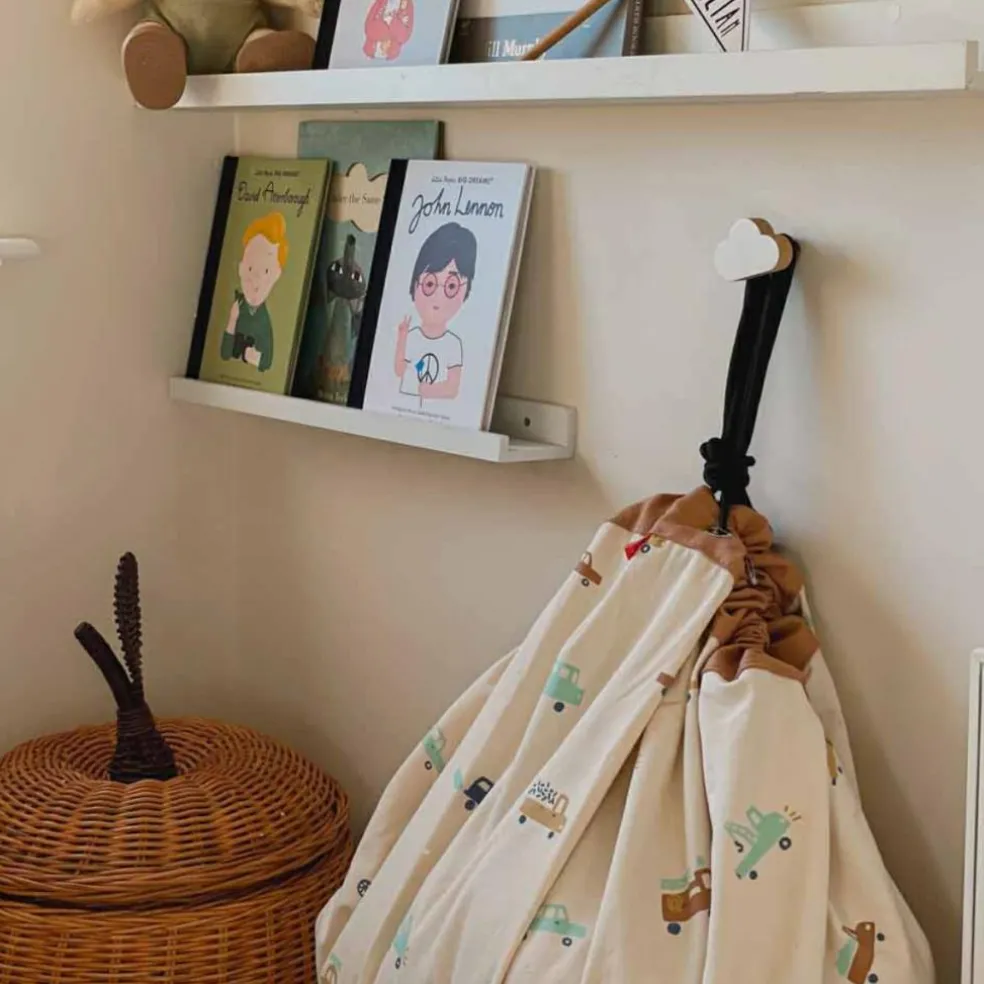 – Transformation en sac à jouets en serrant les liens.