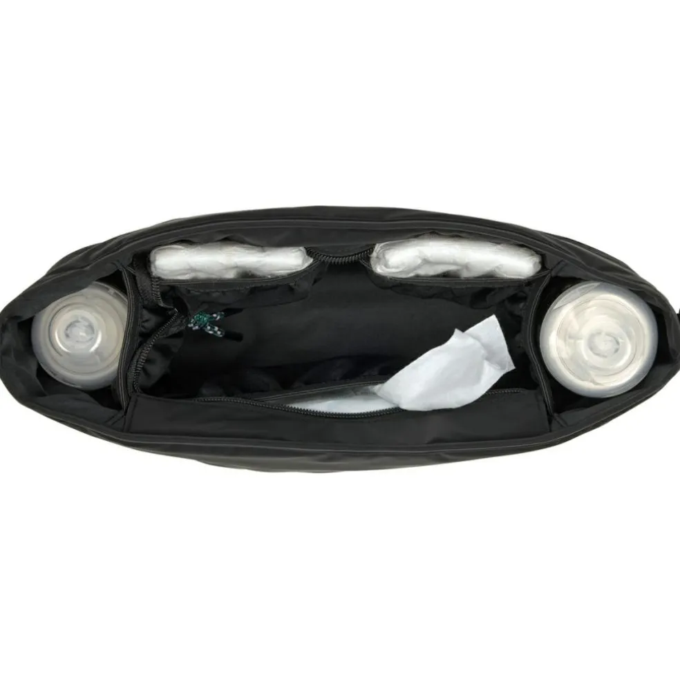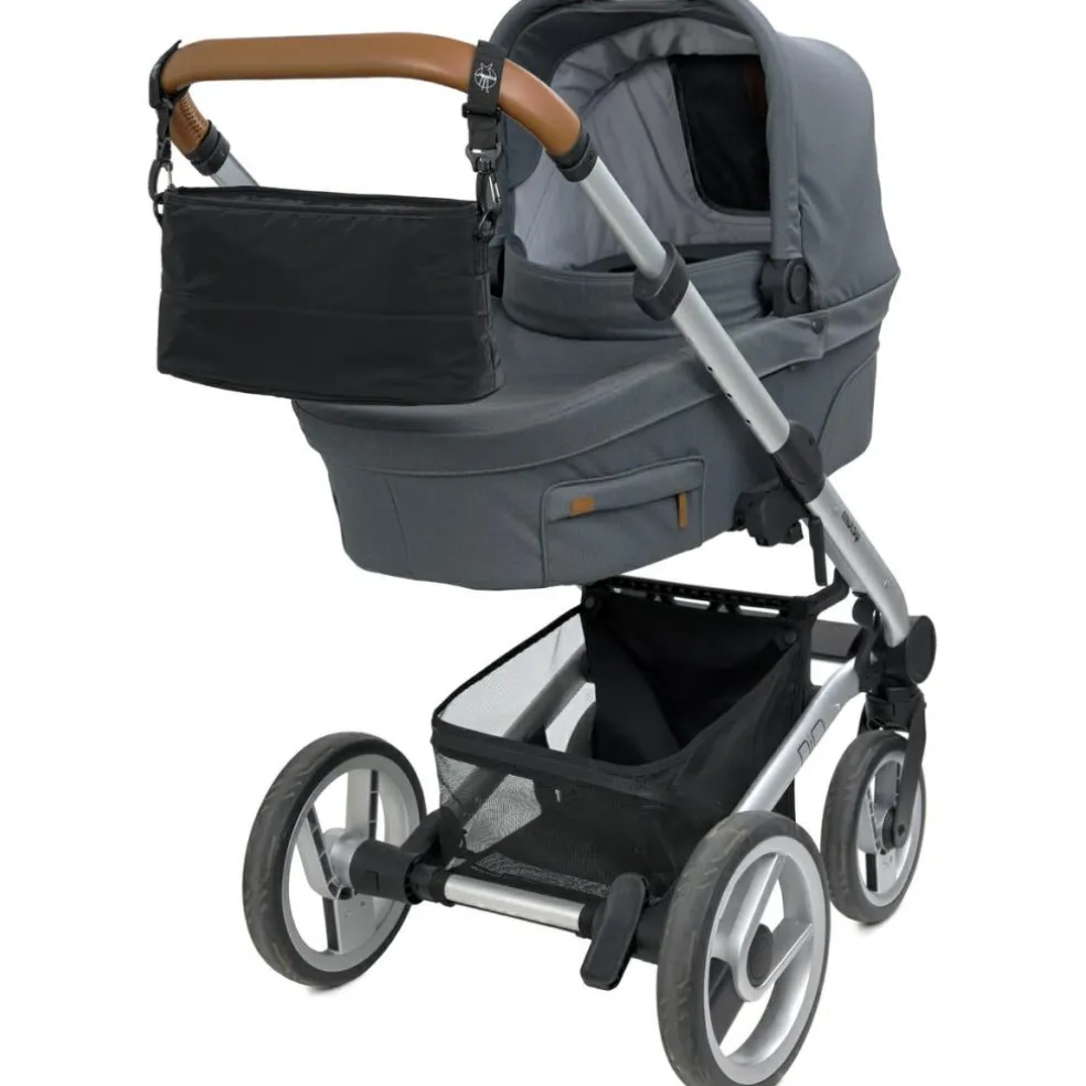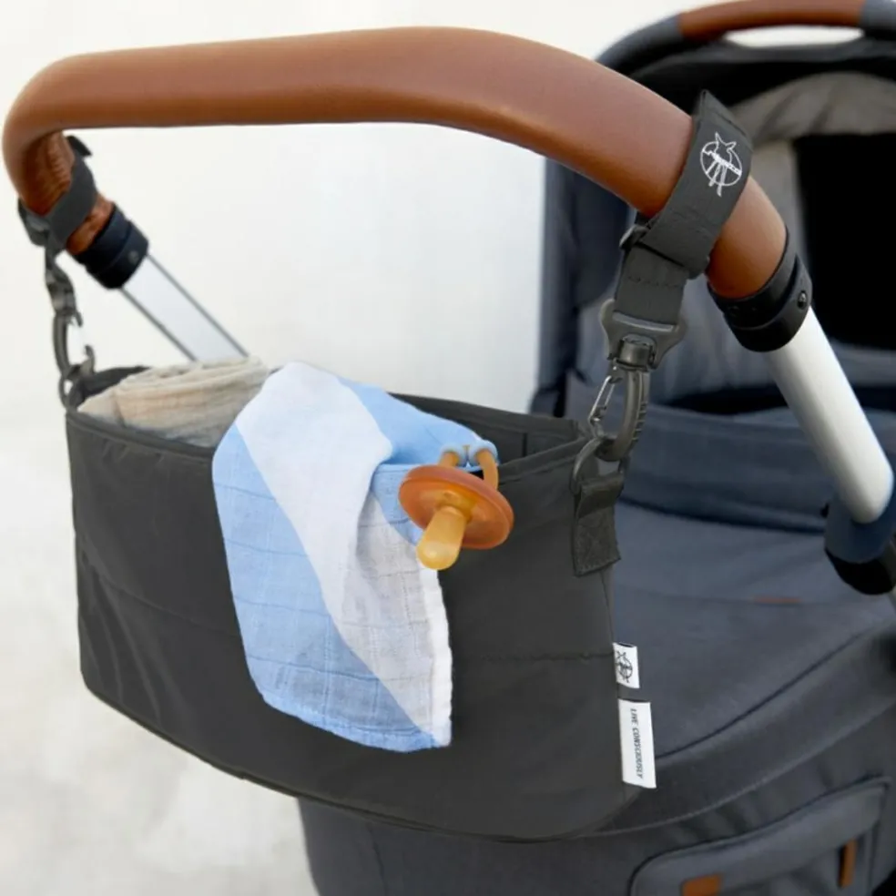 – L’organiseur de poussette se fixe directement à la poussette grâce aux crochets prévus à cet effet.