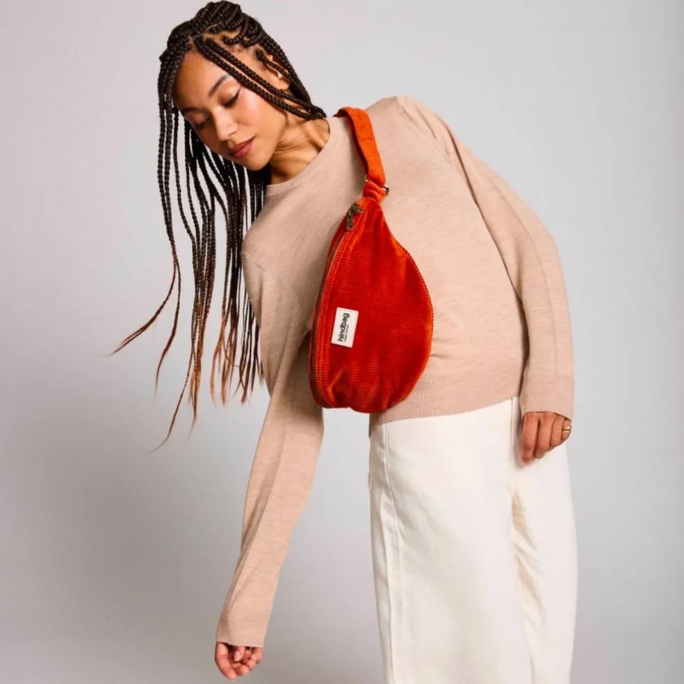 Sasha, c’est la banane version XL, pensée pour ceux qui ont besoin de place sans sacrifier le style. Réalisée en velours côtelé en coton bio certifié GOTS, elle séduit par sa texture douce, sa grande solidité et sa finition soignée. Sa teinte brique, chaleureuse et tendance, apporte une touche automnale et moderne à toutes vos tenues.