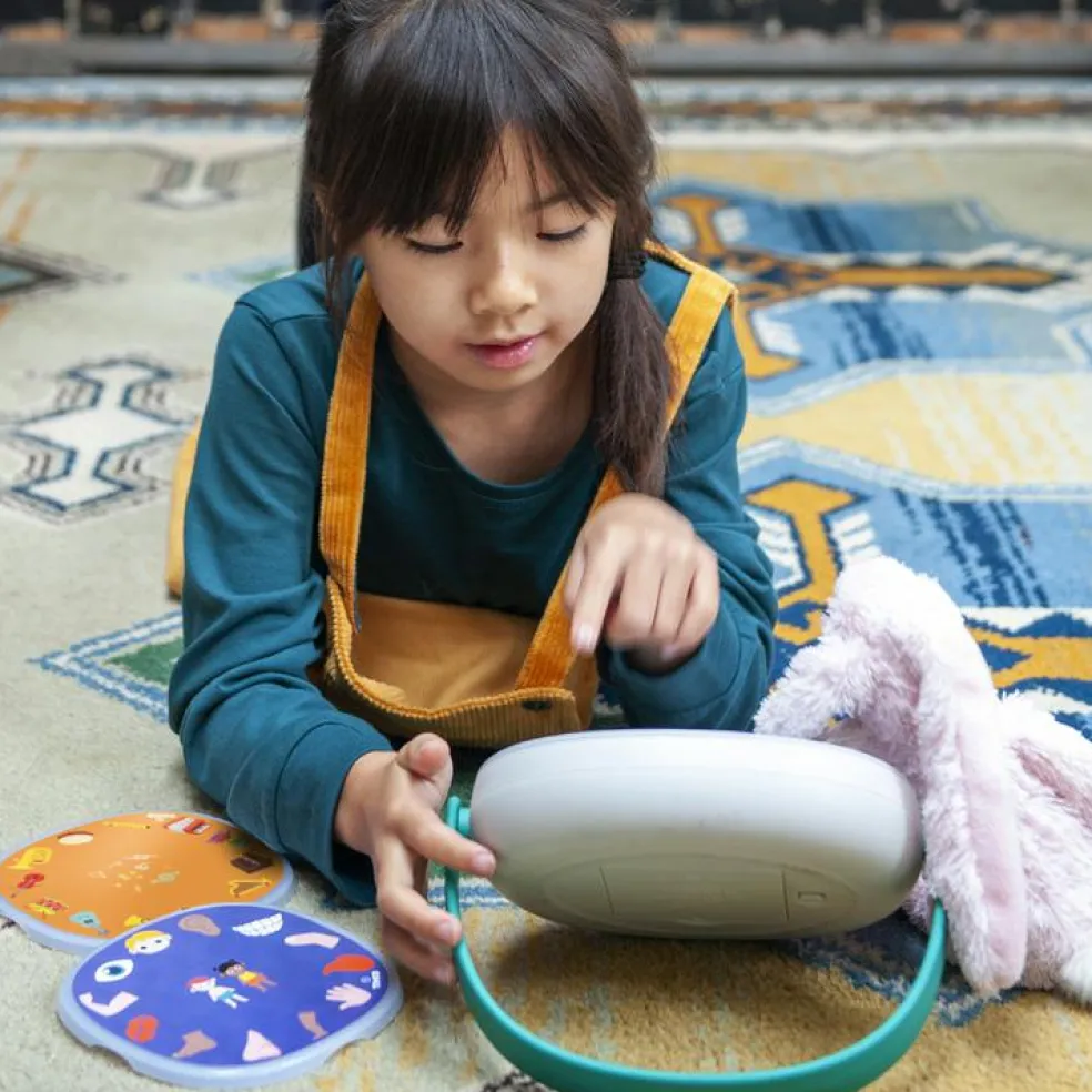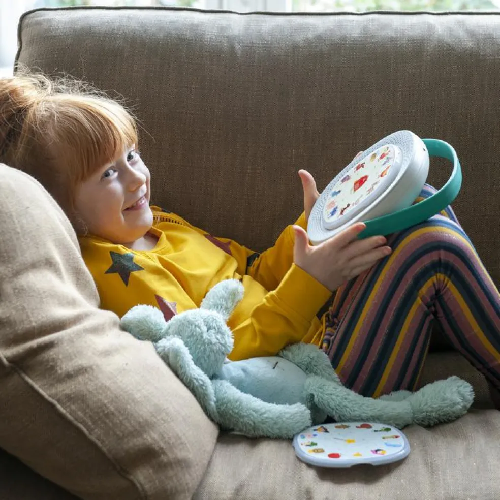 – Placez simplement un disque magnétique sur Timio et appuyez sur une image pour jouer une chanson, écouter une histoire ou apprendre des mots.