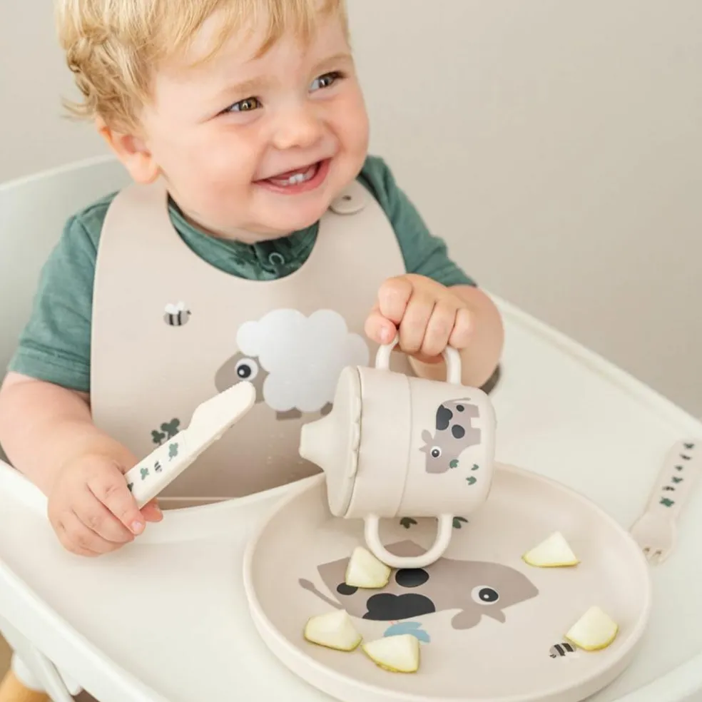 – Set de couverts avec des bords arrondis pour que l’enfant puisse manger en toute sécurité.
