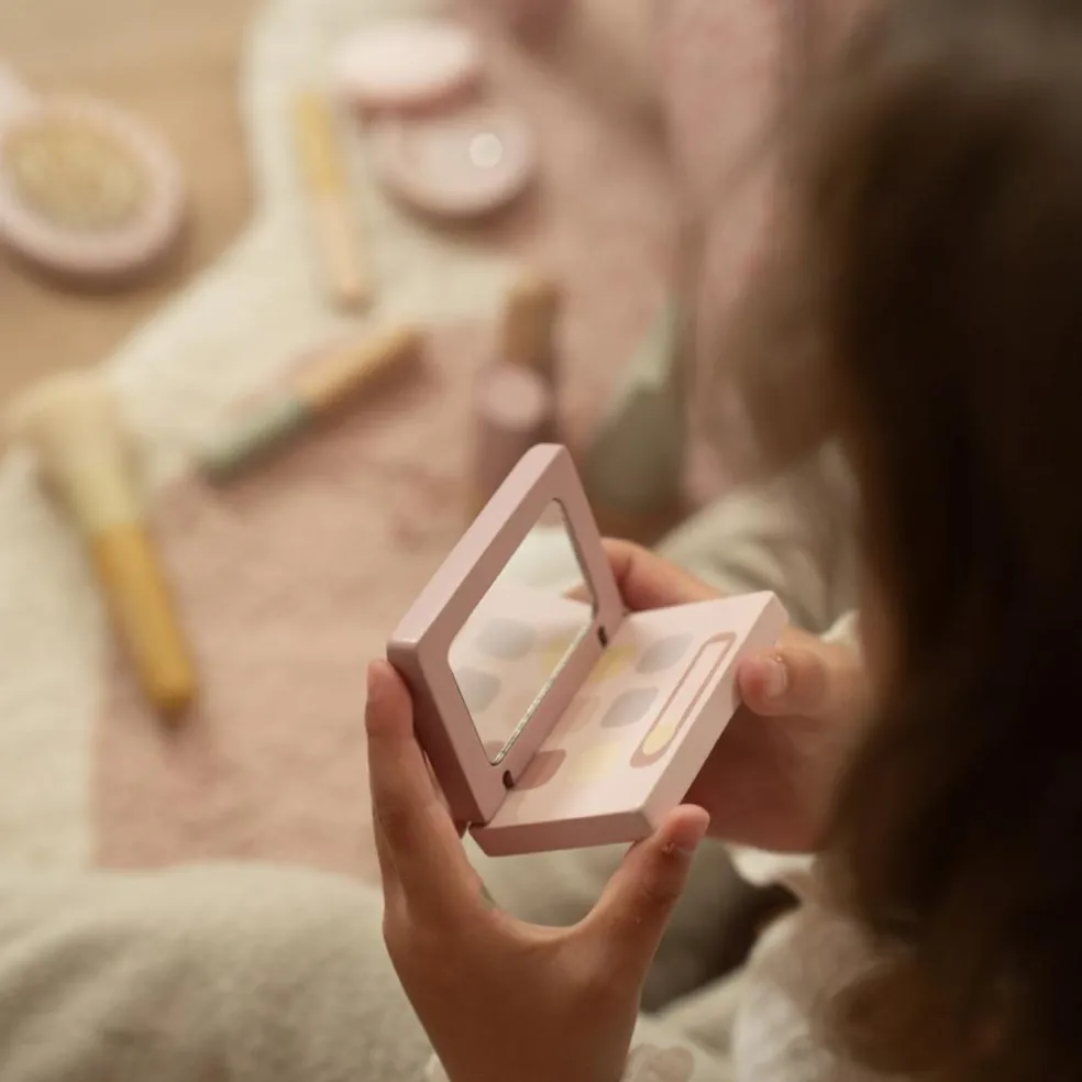 – Contient 10 accessoires en bois FSC : miroir, flacon, tube, rouge à lèvres, vernis, poudre avec houppette, fard, mascara, lime.