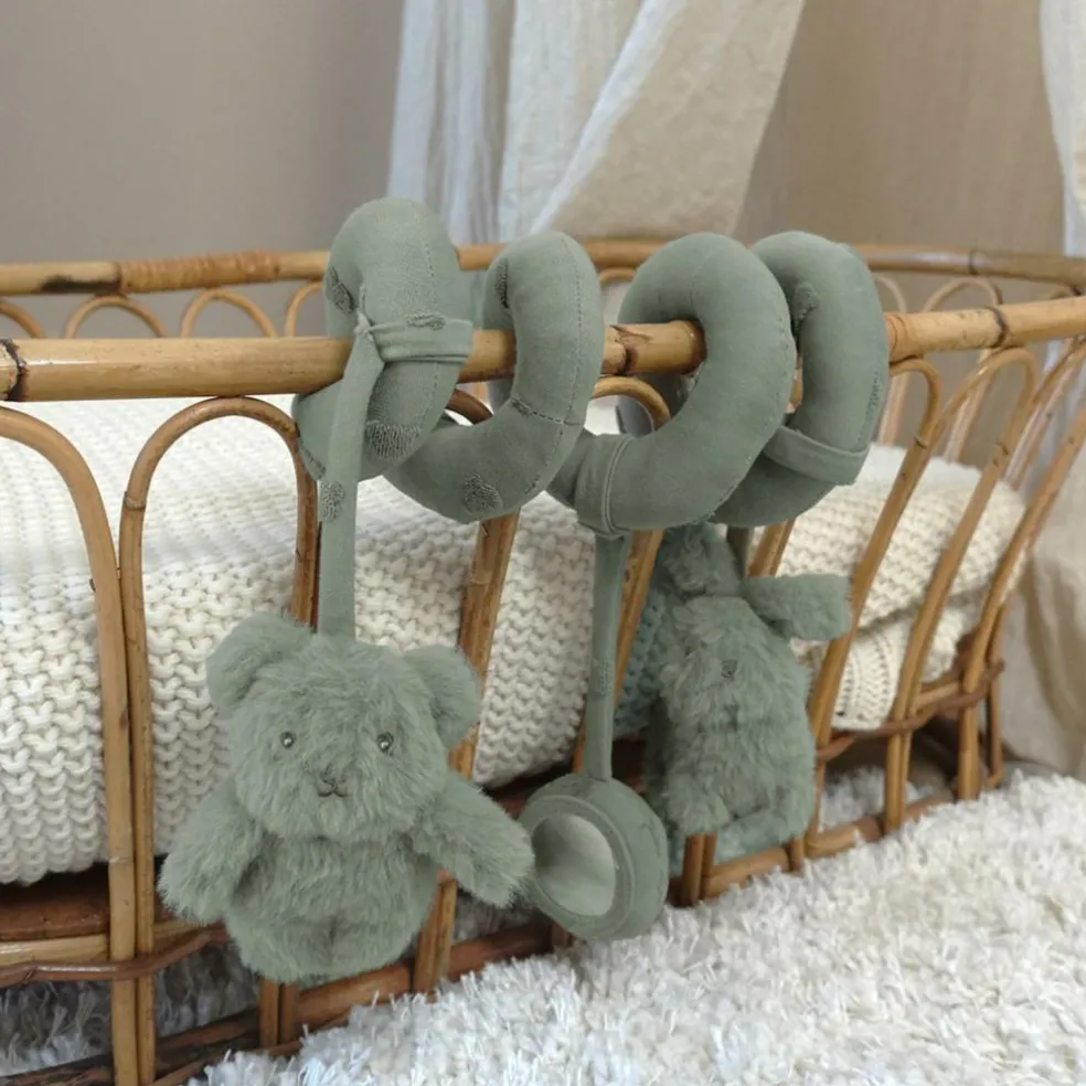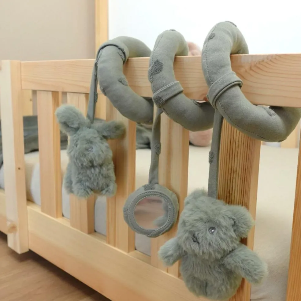 Composée de peluches en forme d’ours et de lapin ainsi que d’un petit miroir souple, cette spirale d’activités favorise le développement sensoriel, visuel et tactile de l’enfant. Son coloris vert sauge, doux et intemporel, apporte une touche naturelle et mixte à l’univers de bébé.