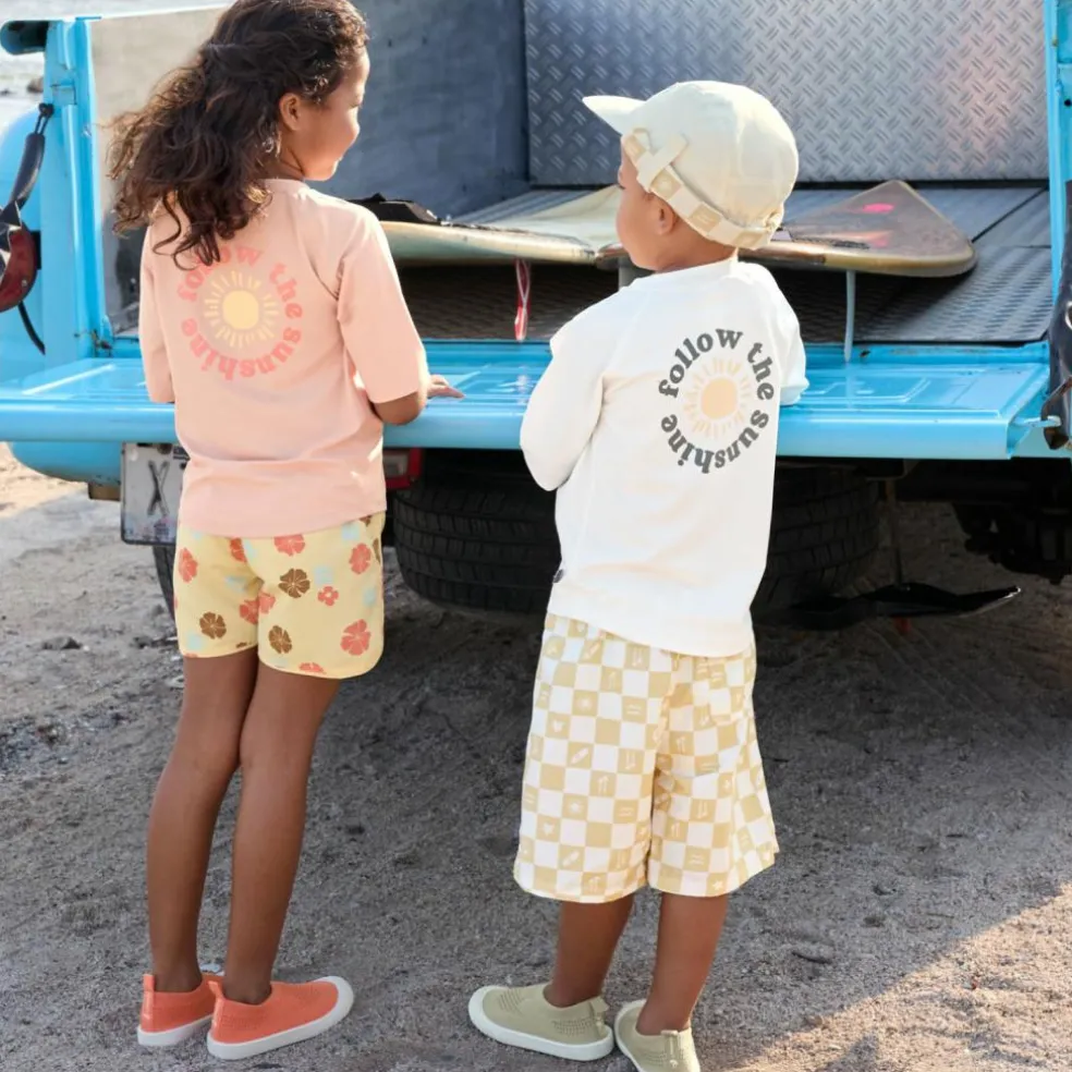 – Avis aux petits surfeurs ! En t-shirt de bains à manches courtes avec un indice de protection UV 60, plus rien n’empêche la prochaine baignade à la plage ou à la piscine.