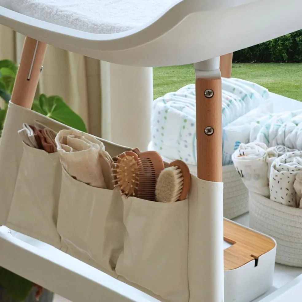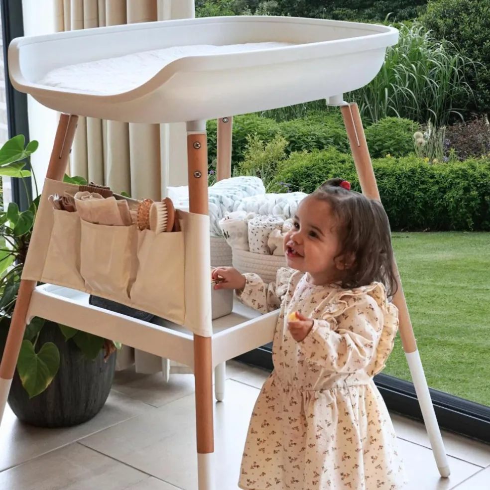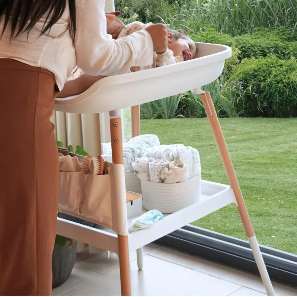 Les deux variantes sont dotées de solidespieds en bois, qui ajoutent une touche chaleureuse et naturelle à l’aspect moderne de la table. Pour plus de confort et de protection, des housses de matelas sont disponibles séparément, ce qui permet de garder la table à langer propre et bien rangée.