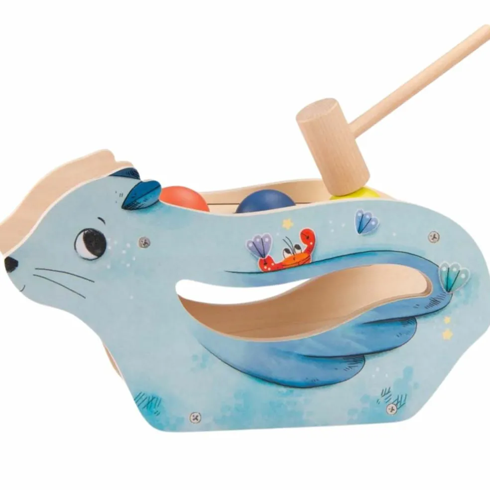 – À l’aide du petit marteau, taper sur les boules de couleur.