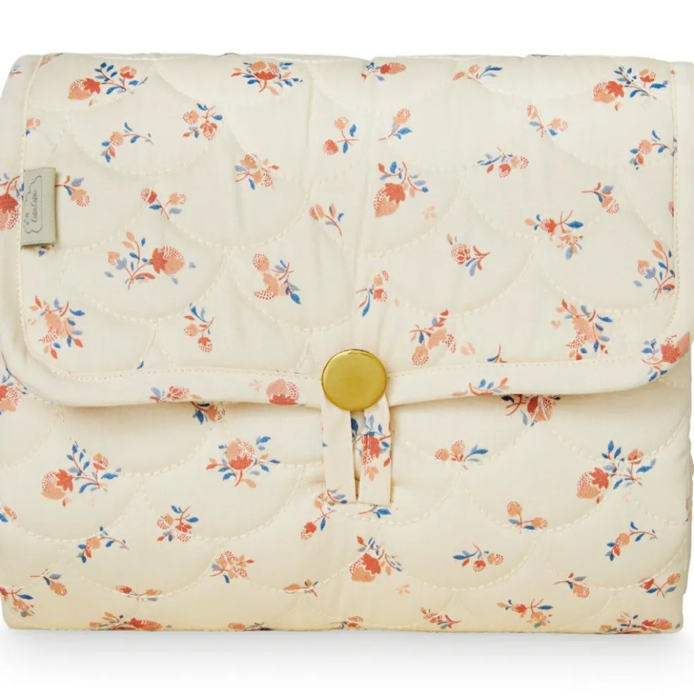 – Matelas à langer de voyage, matelassé dans les tons rose, rouge et bleu sur fond blanc crème.