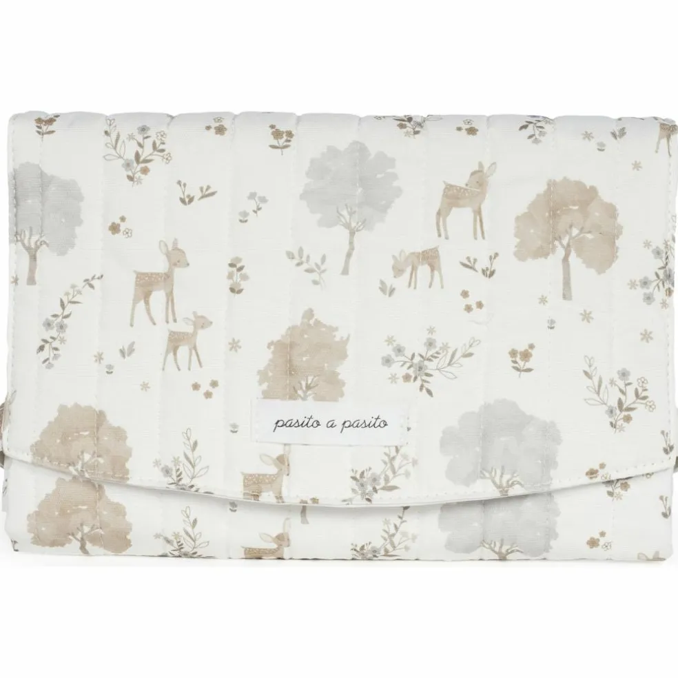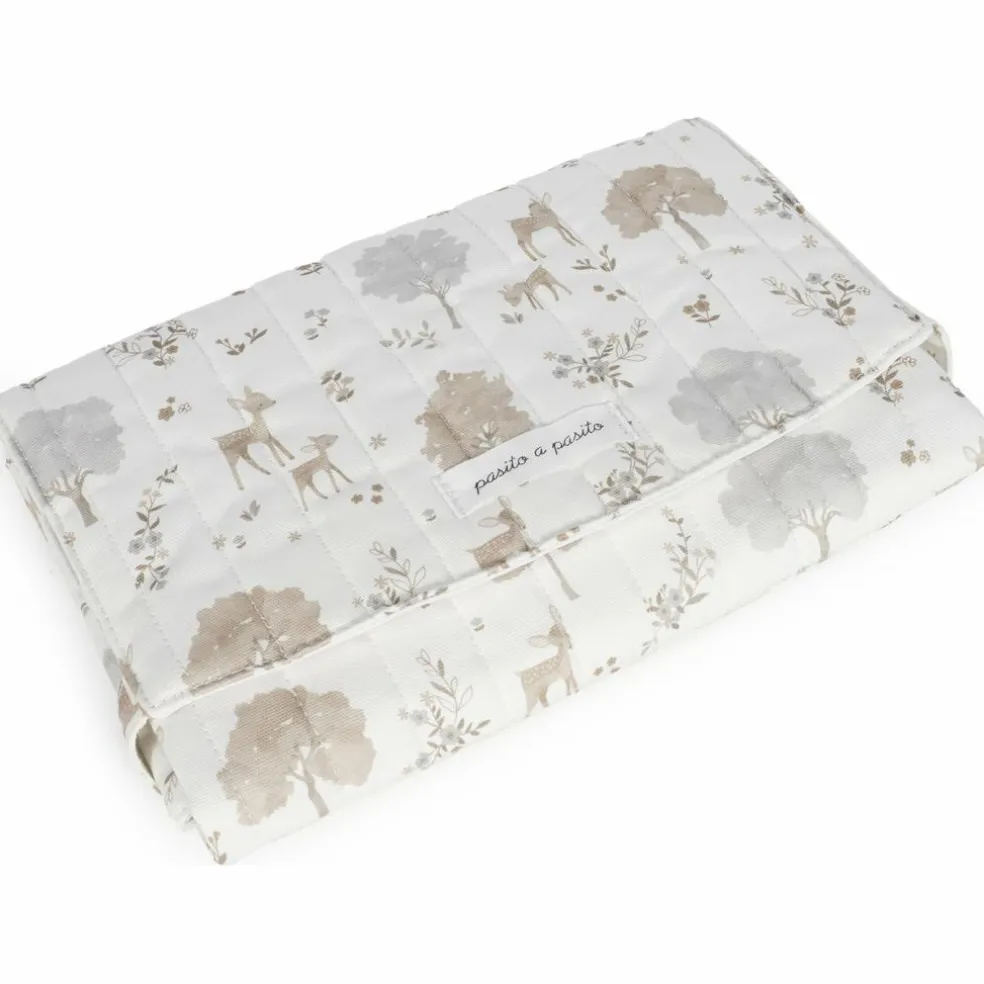 – Le matelas à langer Nara fabriqué en toile de coton 100% avec un délicat imprimé de cerfs et d’arbres dans des tons neutres, est un modèle très confortable, pratique et facile à transporter.