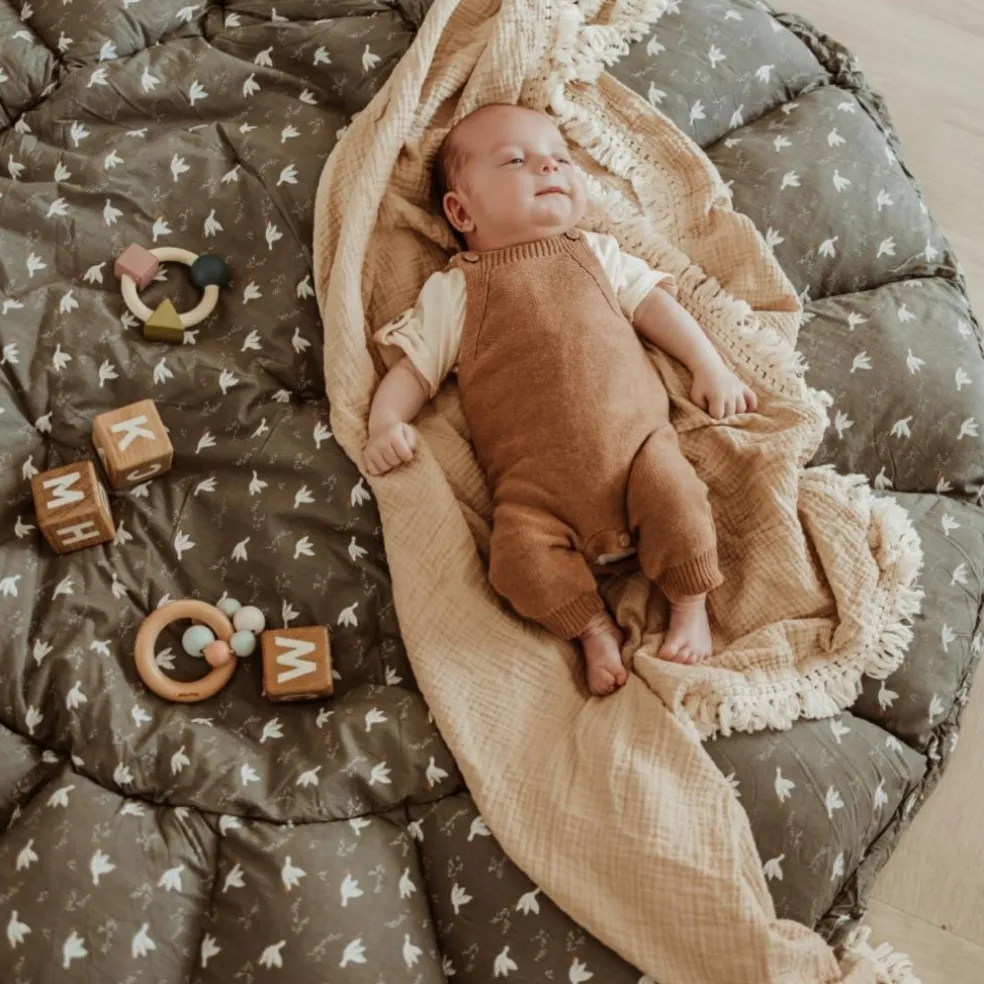 – 3 en 1 : tapis de jeu, sac de rangement pour jouets et cocon nid.