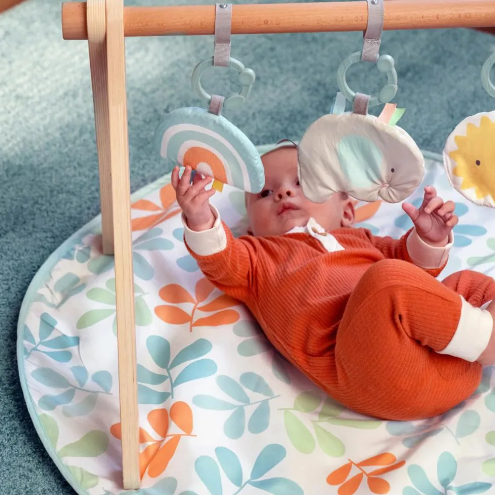 – 3 jouets inclus : un arc-en-ciel en peluche avec carillon, Van l’éléphant avec des étiquettes colorées et un miroir de soleil en tissu doux pour la découverte de soi.