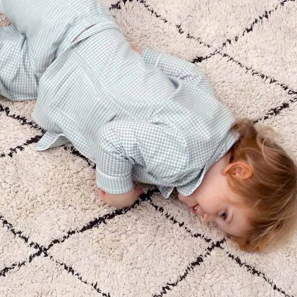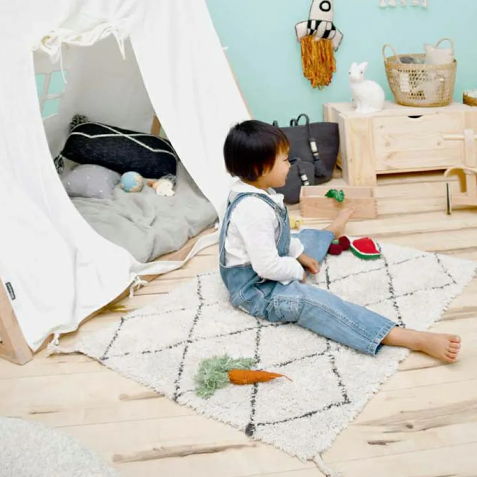 – Mini tapis rectangulaire lavable en couleur naturelle, avec des lignes croisées d’inspiration berbère en noir.