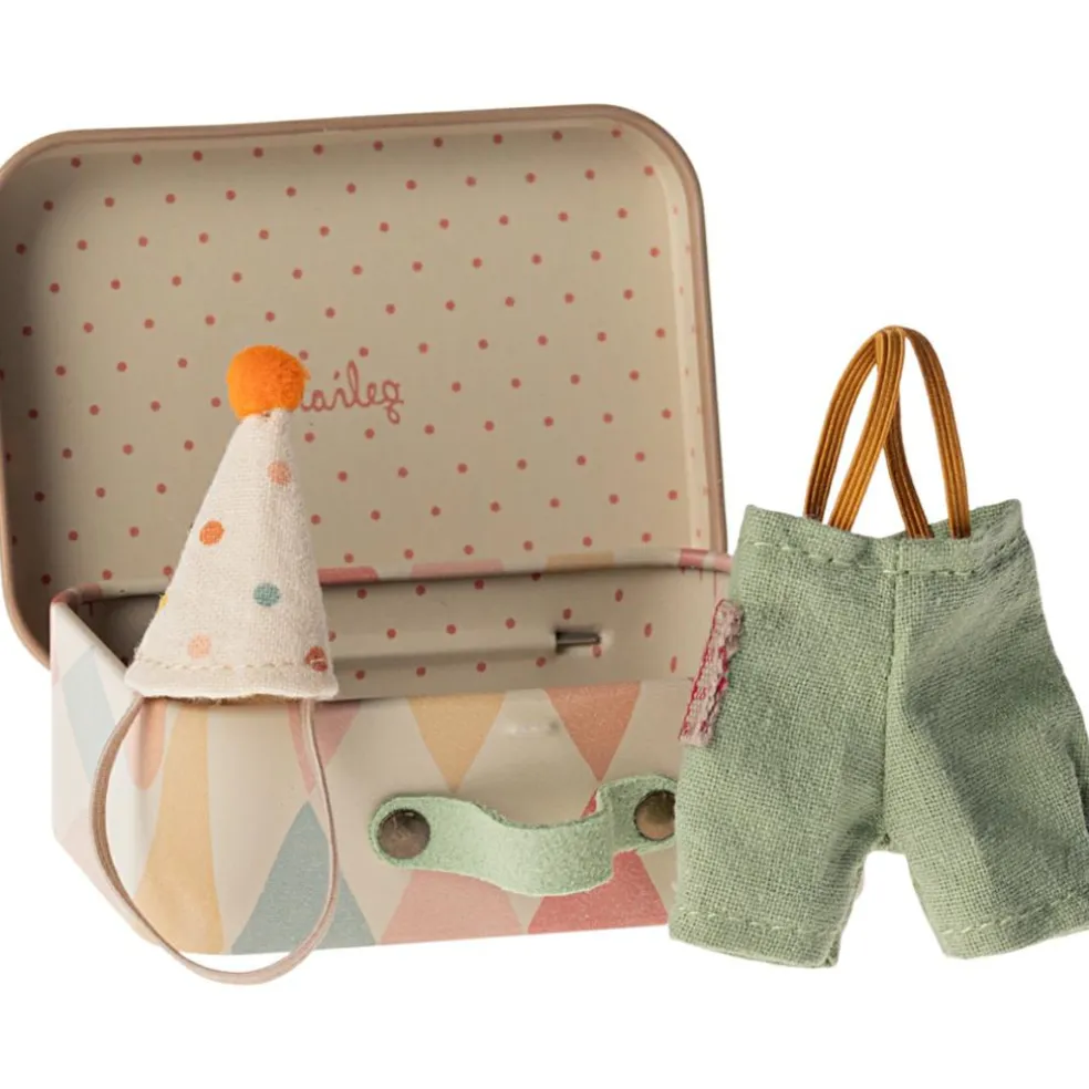 – Cet ensemble comprend un pantalon avec bretelles et un chapeau – le tout présenté dans une valisette en métal, facile à emporter partout.