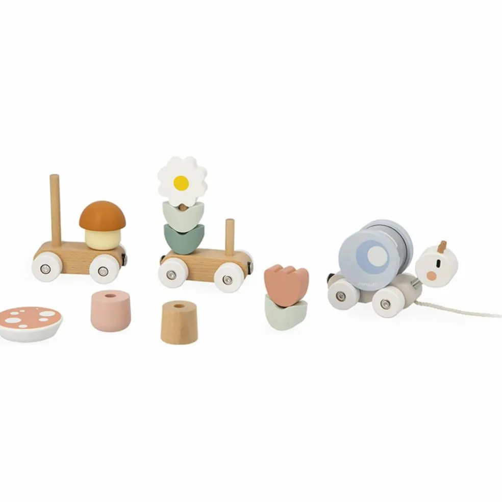 Les formes variées (champignons, fleurs…) invitent bébé à manipuler, réfléchir, créer. Et au fil de ses explorations, il découvre une belle surprise : le premier wagon est un escargot… dont la coquille est un hochet à billes transparent ! Il peut le secouer pour éveiller son ouïe, observer les billes bouger pour stimuler sa vue, et le voir rouler lorsqu’il est posé sur le dos du petit escargot en mouvement.