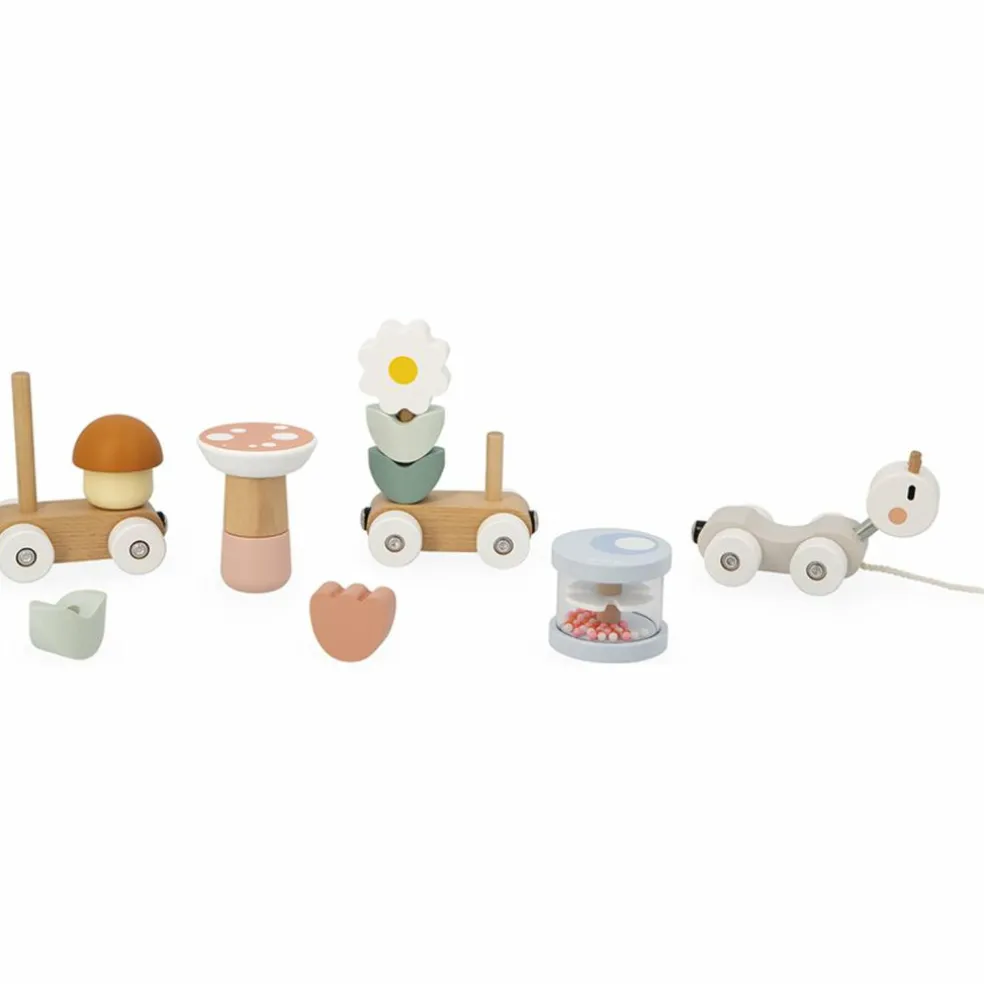 Dès 12 mois, votre tout-petit développe sa motricité et sa curiosité grâce à ce jouet 2 en 1 à tirer et à construire. Dans un univers aux teintes douces et naturelles, il s’amuse à empiler, assembler et tirer son joli train composé de 3 wagons aimantés et de 10 pièces colorées à encastrer.