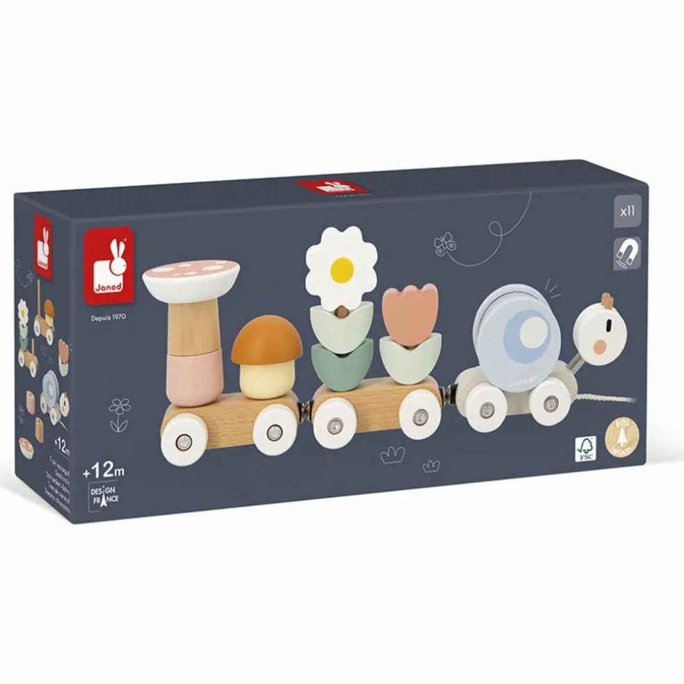 – Contenu de la boîte : 3 wagons aimantés, 10 pièces à empiler, hochet escargot.