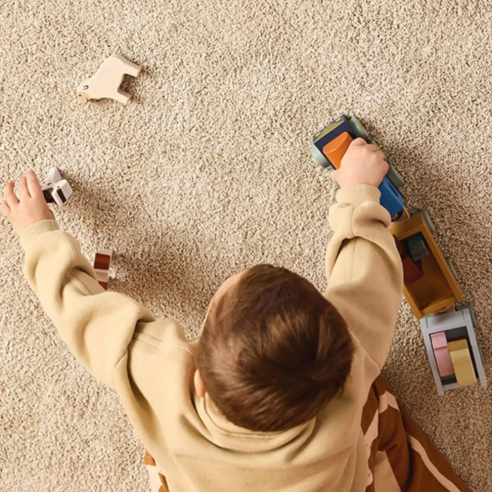 Ce train en bois coloré invite les enfants à découvrir la vie de la ferme tout en stimulant leur imagination. Composé d’une locomotive et de deux wagons, il transporte cinq adorables animaux : Mira la vache, Max le cheval, Poppy le cochon, Bella le mouton et Sture le chat. Les petits peuvent charger et décharger les animaux, inventer des histoires et faire avancer le train en le poussant.