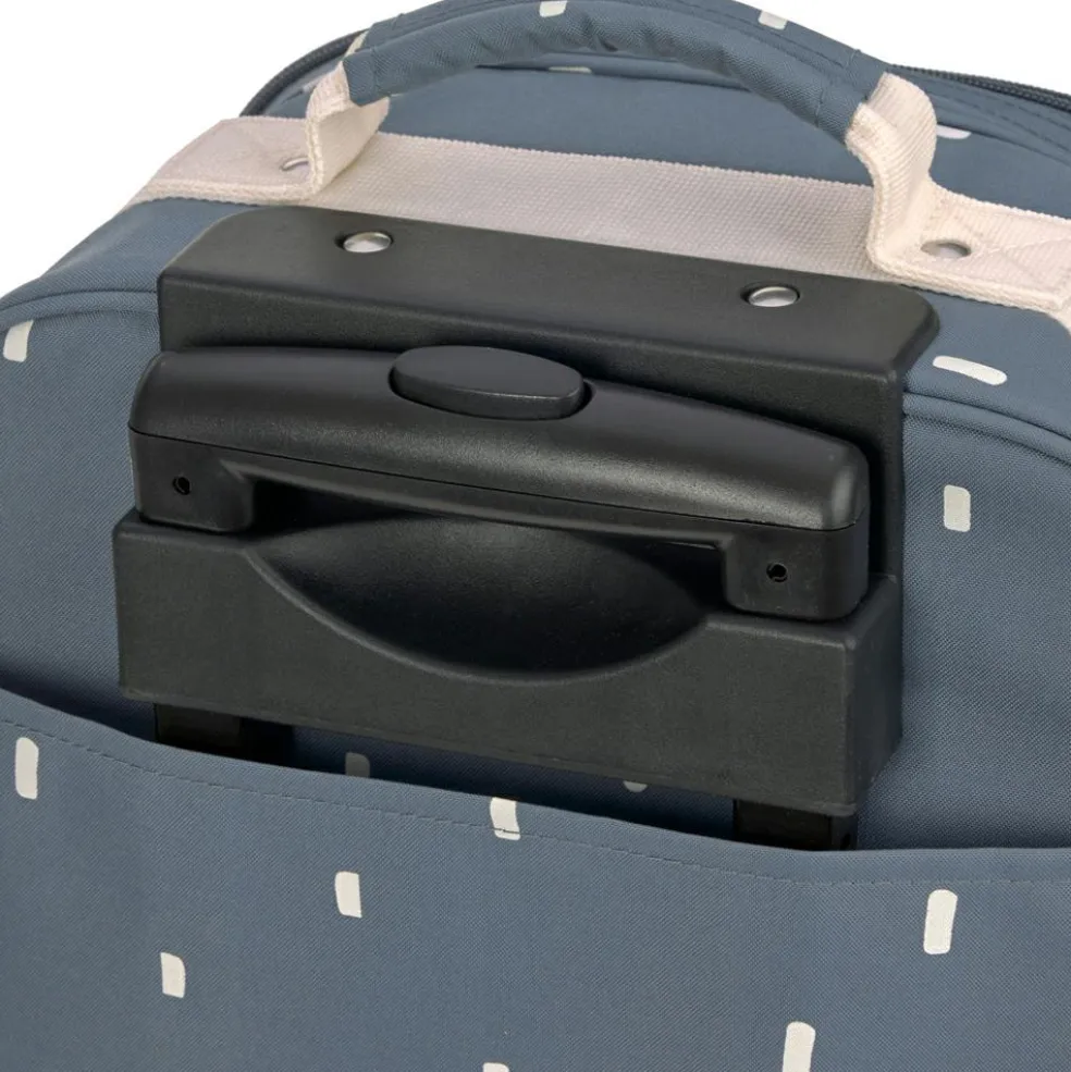 Cette valise à roulettes est idéale pour accompagner votre enfant dans ses premières escapades. Avec son design élégant et ses motifs discrets bleu nuit, elle allie praticité et esthétique pour plaire aux petits comme aux grands.
