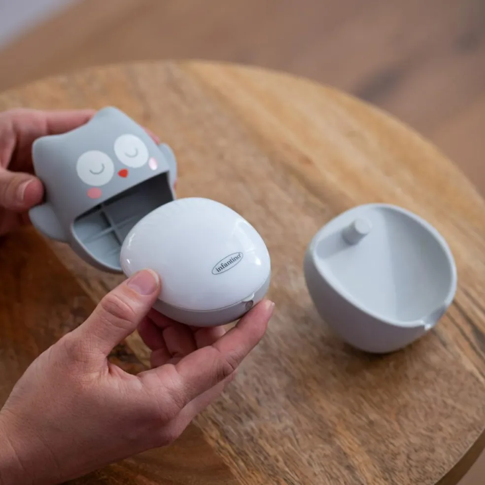 La veilleuse nomade chouette grise de la marque Infantino est à la fois une veilleuse murale, nomade et rechargeable qui accompagnera bébé pour le rassurer et l’apaiser ! Il suffit de retirer la veilleuse du chargeur mural et d’insérer la veilleuse dans l’étui chouette, souple et de forme douce arrondie. Votre enfant peut la transporter facilement n’importe où avec lui et en toute sécurité.