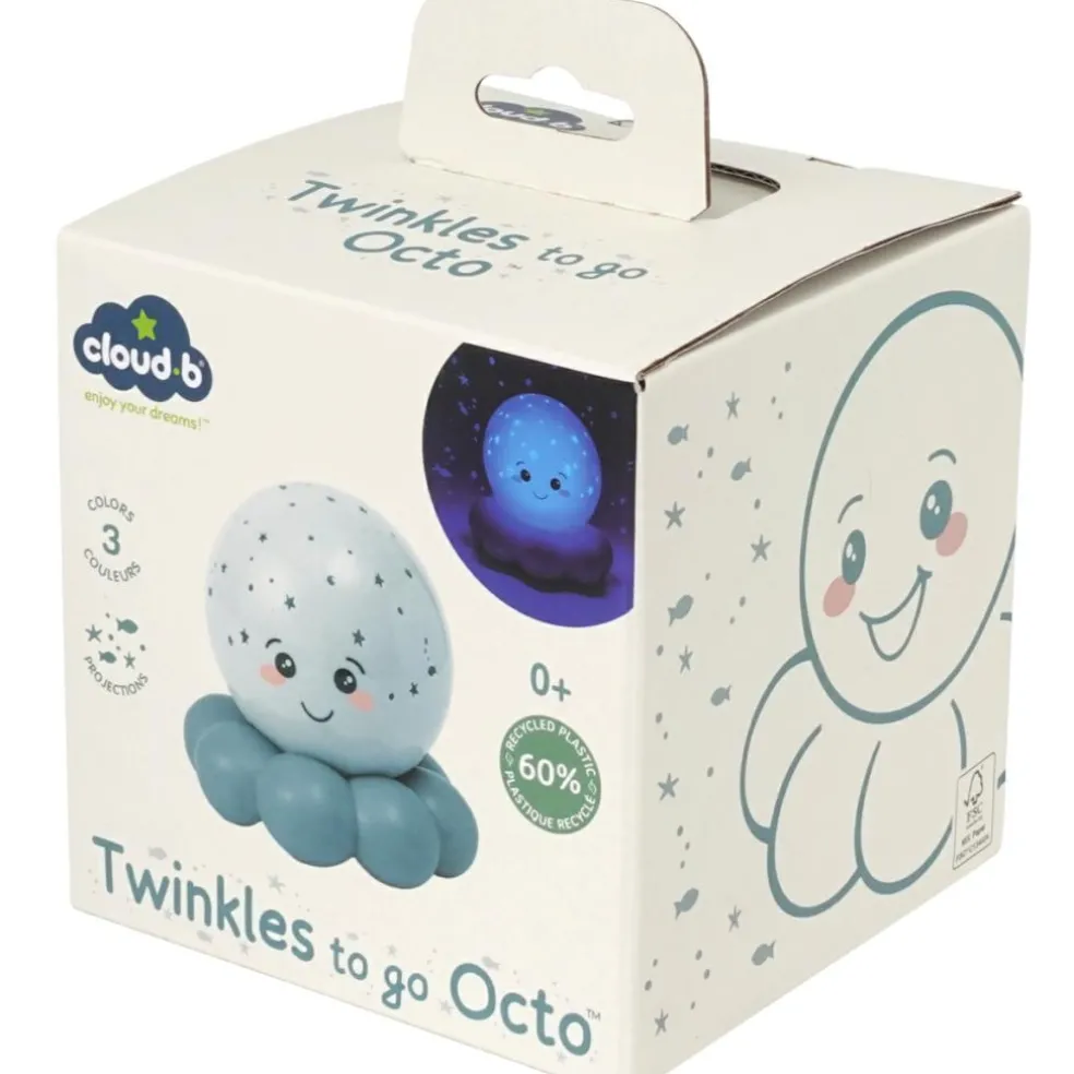 La veilleuse Twinkles To Go Octo bleu pastel est le compagnon idéal en voyage pour accompagner bébé vers un sommeil paisible. Cette petite veilleuse pieuvre projette des motifs amusants d’étoiles, de poissons et de bulles en 3 couleurs.